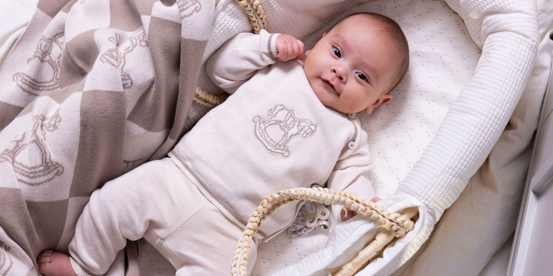All our knitted babywear is made from high-quality materials like pure cashmere, cashmere-cotton blends, and soft cotton. Cashmere offers unmatched softness and warmth, while cotton is breathable, lightweight, and ideal for delicate skin. The combination of these fibres brings the best of both worlds – luxurious comfort and everyday durability. That means you can choose knitted pieces tailored to your baby’s needs and the season, without ever compromising on quality or feel.